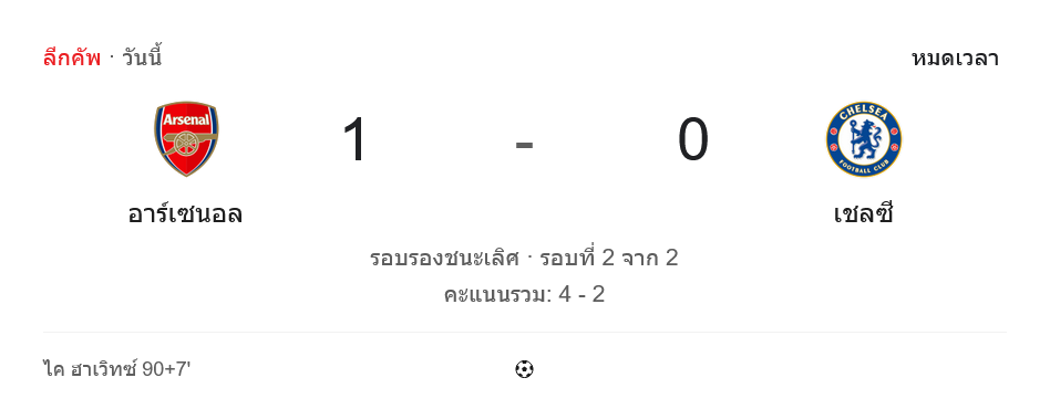 - ⚽ 90+7’ อาร์เซนอล 1-0 ฮาแวร์ตซ์ยิงจ่อ ๆ จากจังหวะสวนกลับ