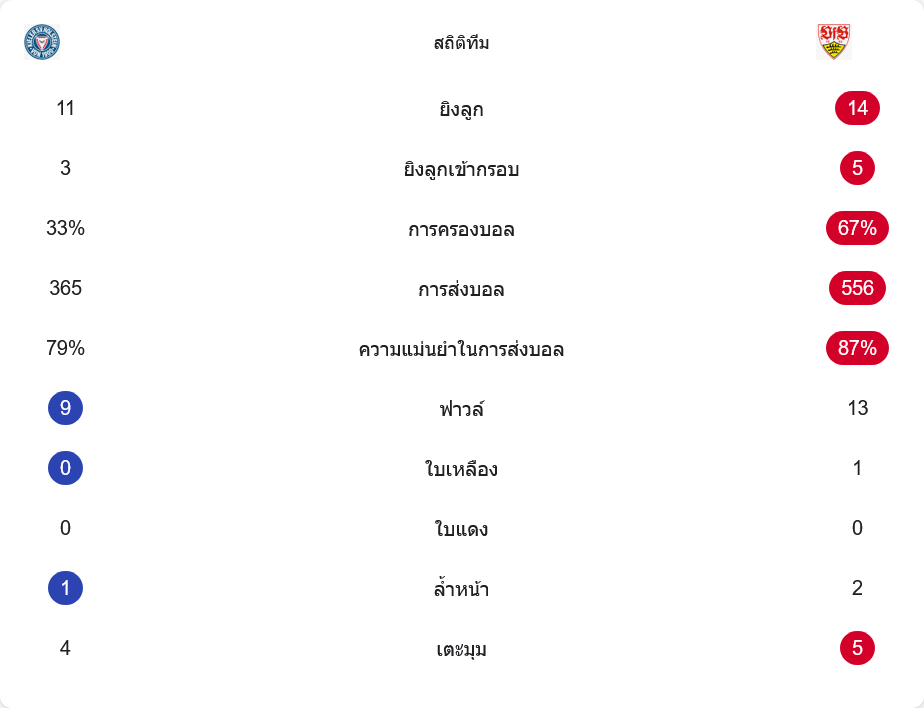 รูปเกมโดยรวม สตุ๊ตการ์ทเป็นฝ่ายครองบอลเหนือกว่าชัดเจนที่ 67 เปอร์เซ็นต์ مقابل 33 เปอร์เซ็นต์ พร้อมจำนวนการส่งบอลมากกว่า 556 ต่อ 365 และความแม่นยำในการจ่ายบอลก็เหนือกว่าที่ 87 เปอร์เซ็นต์ ขณะที่คีลอยู่ที่ 79 เปอร์เซ็นต์ แม้จำนวนการยิงรวมคีลไม่ได้เป็นรองมากนัก 11 ต่อ 14 แต่ความต่างคือความเฉียบคม โดยสตุ๊ตการ์ทยิงเข้ากรอบ 5 ครั้ง ส่วนคีลเข้ากรอบ 3 ครั้ง ฟาวล์รวมสตุ๊ตการ์ทมากกว่าเล็กน้อย 13 ต่อ 9 และเกมนี้มีใบเหลืองเพียง 1 ใบเท่านั้น ขณะที่เตะมุมสตุ๊ตการ์ทได้ 5 ครั้ง คีลได้ 4 ครั้ง ภาพรวมคือทีมเยือนคุมเกมได้ครบทั้งบอลและจังหวะสุดท้าย