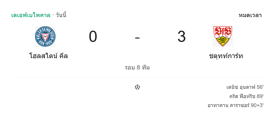รายการนี้ไม่มีตารางคะแนนแบบลีกให้ไล่แต้มกัน แต่ผลสกอร์ 0-3 คือคำตอบชัดๆ ในเส้นทางลุ้นแชมป์ถ้วย สตุ๊ตการ์ทขยับตัวเองเข้าสู่รอบรองชนะเลิศได้สำเร็จ ส่วนโฮลสไตน์ คีลต้องหยุดเส้นทางไว้แค่รอบนี้ และหันไปโฟกัสงานลีกต่อแบบไม่มีทางเลือก