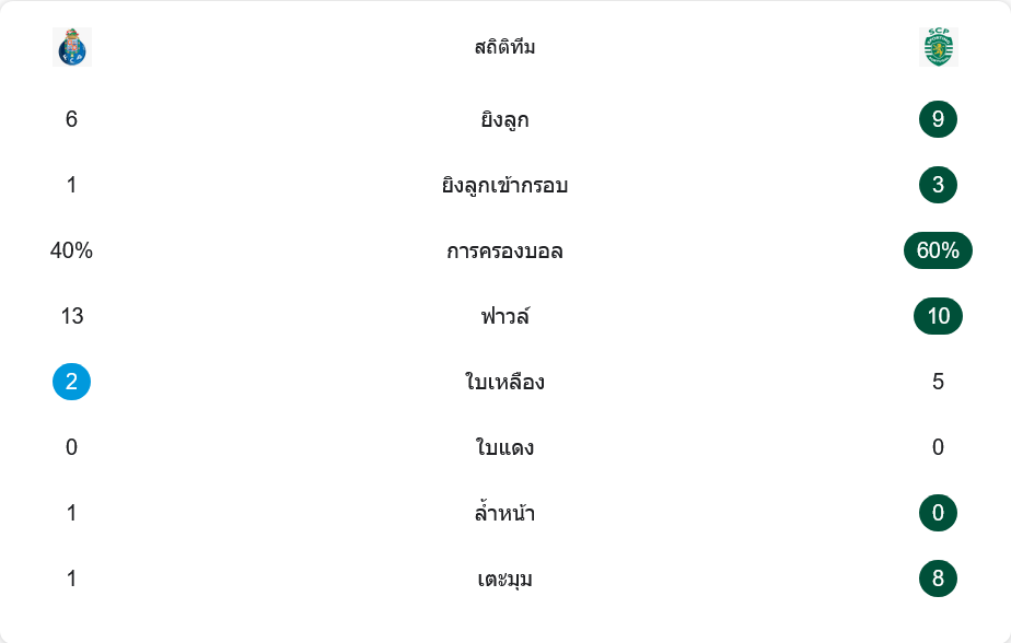 ตัวเลขหลังเกมบอกชัดว่าสปอร์ติ้งเหนือกว่าพอสมควร ทีมเยือนมีโอกาสยิง 9 ครั้ง เข้ากรอบ 3 ส่วนปอร์โต้ยิงได้แค่ 6 ครั้ง เข้ากรอบเพียง 1 จากประตูของโฟฟานา การครองบอลสปอร์ติ้งกินขาด 60% ต่อ 40% แปลว่าปอร์โต้ต้องวิ่งไล่บอลเกือบทั้งเกม แต่ก็ยังยืนระยะชนกับคู่แข่งได้ดี
