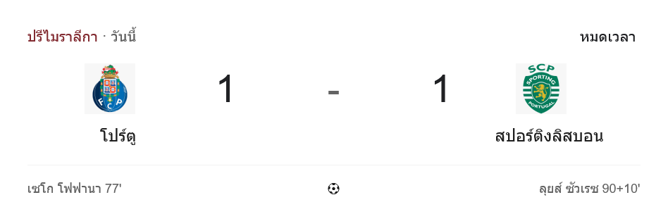 จาก : ผลบอลสด ซูเปอร์ลีกา โปรตุเกส ระหว่าง ปอร์โต้ 1-1 สปอร์ติ้ง ลิสบอน วันนี้ 10/2/69 – บ้านกีฬา