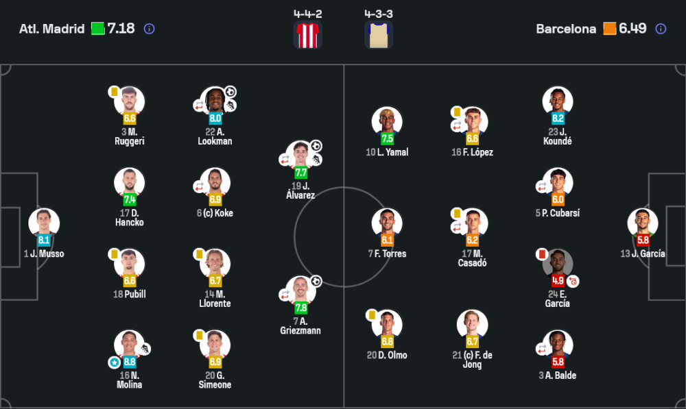 นอกจากโมลินาแล้ว ฮวน มุสโซ ผู้รักษาประตู 8.1 คะแนน กับ อเดโมล่า ลุคแมน 8.0 ก็โดดเด่นไม่แพ้กัน ขณะที่ฝั่งบาร์ซ่า คนที่พอจะยืนได้คือ ฌูลส์ กูนเด้ กับ ลามีน ยามาล ที่พยายามแบกทีมแต่ก็ไม่สามารถต้านความแน่นของเจ้าบ้านได้