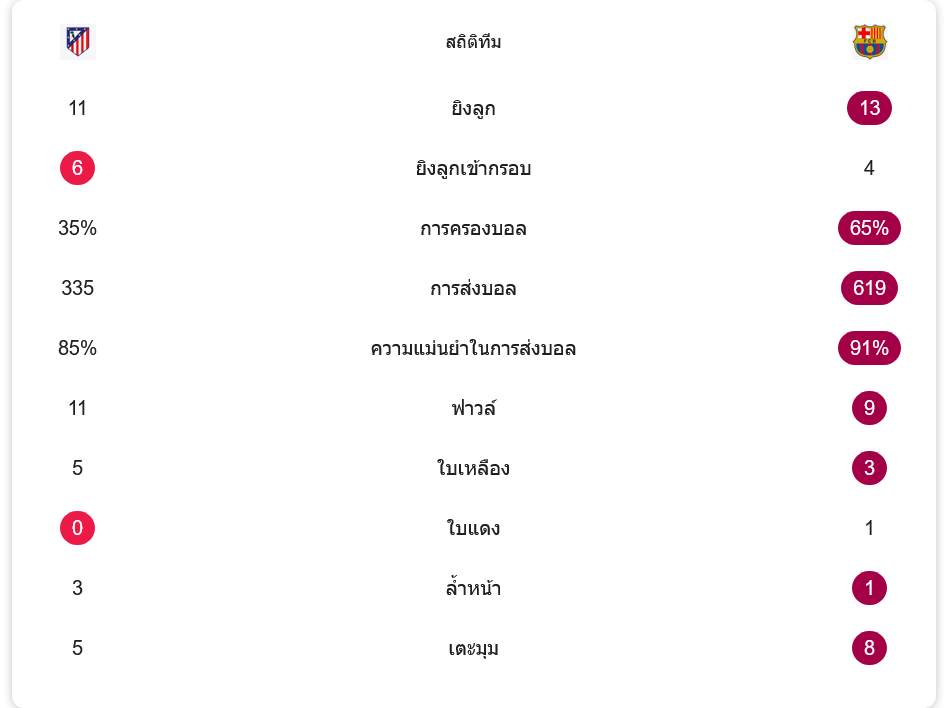 แม้ตัวเลขจะชี้ว่าบาร์เซโลนาครองบอลถึง 65% ต่อ 35% ของเจ้าบ้าน และผ่านบอลมากกว่า 619 ต่อ 335 ครั้ง พร้อมอัตราความแม่นยำ 91% เหนือกว่า 85% ของตราหมี แต่สิ่งที่ตัดสินเกมคือประสิทธิภาพในพื้นที่สุดท้าย แอตเลติโกยิง 11 ครั้ง เข้ากรอบ 6 และเปลี่ยนเป็น 4 ประตูเต็มๆ ขณะที่บาร์ซ่ายิงมากกว่าที่ 13 ครั้ง เข้ากรอบเพียง 4 ลูก เท่านั้น