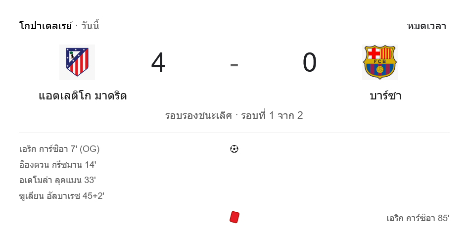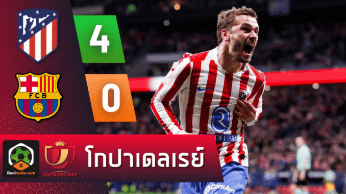 ศึก โกปา เดล เรย์ รอบรองชนะเลิศ นัดแรก ที่เมโทรโปลิตาโน่ กลายเป็นคืนที่แฟนตราหมีจำไม่ลืม เมื่อแอตเลติโก มาดริด ไล่บดบาร์เซโลนาเละเทะ 4-0 แบบไม่เกรงใจใคร แม้รูปเกมตามตัวเลขในหน้า ผลบอลสด จะบอกว่าบาร์ซ่าครองบอลเหนือกว่า แต่ความเฉียบคมและความดุดันอยู่ฝั่งเจ้าบ้านเต็มๆ ทำให้เส้นทางเข้าชิงเปิดโล่งสุดๆ