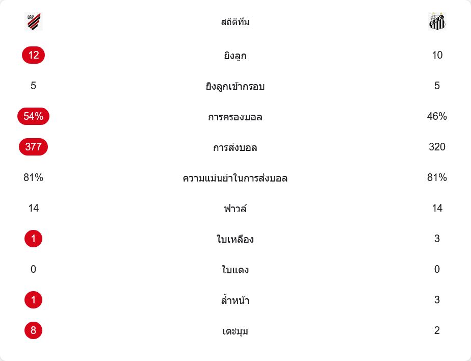 สถิติหลังจบเกมสะท้อนภาพได้ชัดว่าเป็นแมตช์ที่สูสีแต่มีรายละเอียดเล็กๆ ตัดสินผล แอตเลติโก พาราเนนเซ่ ยิงทั้งหมด 12 ครั้ง เข้ากรอบ 5 ครั้ง ส่วนซานโตสยิง 10 ครั้ง เข้ากรอบ 5 ครั้งเท่ากัน การครองบอลเจ้าถิ่นเหนือกว่านิดหน่อยที่ 54% ต่อ 46% แสดงให้เห็นว่าพวกเขาไม่ได้อุดแล้วสวน แต่กล้าถือบอลคุมจังหวะเอง