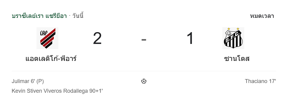 ศึกฟุตบอลบราซิล เซเรีย เอ ที่อารีน่า บาอิกซาด้า แอตเลติโก พาราเนนเซ่ เปิดบ้านรับการมาเยือนของซานโตส เกมนี้ทั้งสองทีมต่างต้องการ ผลบอล ที่เป็นสามแต้มเต็มเพื่อขยับสถานการณ์ในตาราง โดยฝั่งเจ้าถิ่นหวังรักษาฟอร์มร้อนแรง ส่วนทีมเยือนกำลังดิ้นหนีโซนท้ายตาราง ทำให้จังหวะปะทะกันทุกลูกดุดันตั้งแต่นาทีแรก สมฐานะเกมระดับหัวตารางชนโซนล่างอย่างแท้จริง และแน่นอนว่าแฟนบอลสายเช็กสกอร์แบบเรียลไทม์คงได้เสพ ผลบอลสด กันแบบลุ้นจนวินาทีสุดท้าย