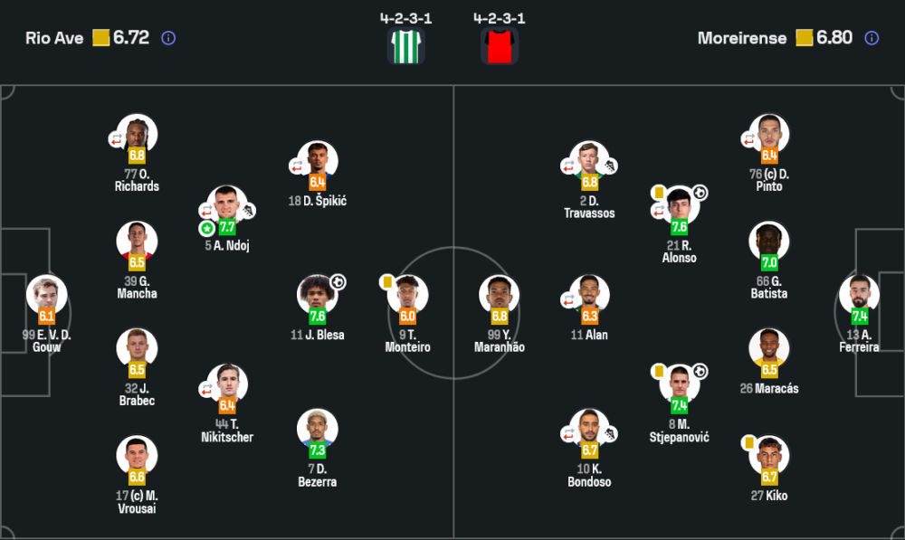 ด้านโมไรเรนเซ่ เลือกเล่นในสไตล์คอนโทรลโซนกลางสนาม ใช้คู่กลาง Alonso – Batista ช่วยปิดพื้นที่หน้ากรอบและดักจังหวะสวนกลับ ส่วนสามตัวรุก Travassos, Alan, Maranhão เคลื่อนที่สลับตำแหน่งดึงแนวรับริโอ อาฟหลุดตำแหน่งบ่อย การรับจะถอยลงเป็นบล็อก 4-5-1 ให้ช่องว่างระหว่างไลน์แคบ ทำให้เจ้าถิ่นต้องยิงไกลหรือเปิดโด่งมากกว่าการเจาะเข้ากรอบเขตโทษ