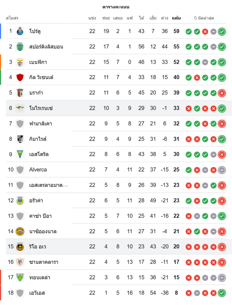 📌 สถานการณ์บนตารางคะแนน ปรีไมราลีกา โปรตุเกส