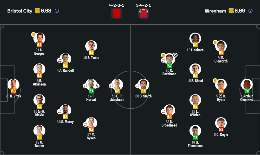 บริสตอล ซิตี้เริ่มเกมด้วยแผน 4-2-3-1 ที่หวังครองเกมและต่อบอลทะลุไลน์ แต่ครึ่งแรกติดปัญหาชัดเจนตรงการพาบอลผ่านแดนกลาง เพราะเร็กซ์แฮมยืน 3-4-2-1 แล้วบีบพื้นที่โซนฮาล์ฟสเปซเก่ง ทำให้บอลของเจ้าถิ่นต้องออกข้างบ่อย และเมื่อเปิดเข้ามาก็ถูกแพ็กพื้นที่หน้ากรอบไว้แน่น