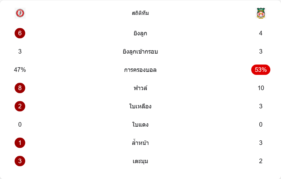 เกมนี้บริสตอล ซิตี้ยิงทั้งหมด 6 ครั้ง ส่วนเร็กซ์แฮมยิง 4 ครั้ง แต่ความน่าสนใจคือโอกาสยิงเข้ากรอบจบที่ 3 ครั้งเท่ากัน แปลว่าทั้งสองทีมคมพอกันในจังหวะที่ได้ลุ้นจริง การครองบอลเร็กซ์แฮมทำได้มากกว่าที่ 53 เปอร์เซ็นต์ ขณะที่บริสตอลอยู่ที่ 47 เปอร์เซ็นต์ สะท้อนภาพทีมเยือนที่คุมจังหวะได้ช่วงหนึ่งและพยายามชะลอเกมหลังขึ้นนำ ฟาวล์รวมเร็กซ์แฮม 10 ครั้ง มากกว่าบริสตอลที่ 8 ครั้ง และจำนวนใบเหลืองเร็กซ์แฮมโดน 3 ใบ มากกว่าบริสตอลที่ 2 ใบ นอกจากนี้เร็กซ์แฮมล้ำหน้าถึง 3 ครั้ง ขณะที่บริสตอลล้ำหน้า 1 ครั้ง ส่วนเตะมุมบริสตอลได้ 3 ครั้ง เร็กซ์แฮม 2 ครั้ง เป็นเกมที่ตัวเลขบอกชัดว่าใครคุมบอลได้มากกว่า แต่ใครใจสู้กว่าในช่วงท้าย