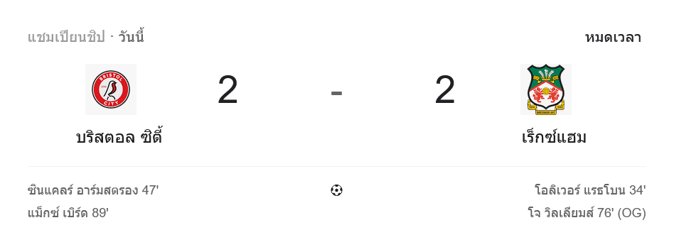 บ้านกีฬา พาเกาะเกมแบบเน้นๆกับ ผลบอลสด คู่เดือดที่เล่นกันเหมือนมีแต้มเพลย์ออฟเป็นเดิมพันตั้งแต่วินาทีแรก บริสตอล ซิตี้พยายามคุมทรงตามสไตล์ 4-2-3-1 วางบอลขึ้นจากแดนหลัง หาจังหวะให้ตัวรุกวิ่งสอด ส่วนเร็กซ์แฮมมาใน 3-4-2-1 เน้นบีบกลางสนามแล้วสวนกลับไว เล่นงานพื้นที่ด้านข้างตลอด