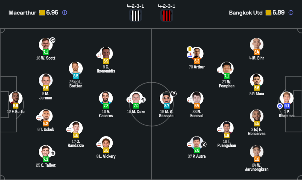 ฝั่งแบงค็อกเล่นฉลาดแบบทีมที่กุมความได้เปรียบ สร้างเกมรุกด้วยการเปลี่ยนจังหวะเร็ว ใช้พิชากับอัล กาสซานี่เป็นตัวจบและตัวพักบอลในพื้นที่อันตราย จุดที่ทำร้ายแม็คอาร์เธอร์หนักคือจังหวะยิงไกลและการเข้าทำที่ไม่ต้องต่อบอลเยอะ สองประตูในครึ่งแรกมาจากคุณภาพการตัดสินใจล้วนๆ ได้บอลแล้วลงโทษทันที