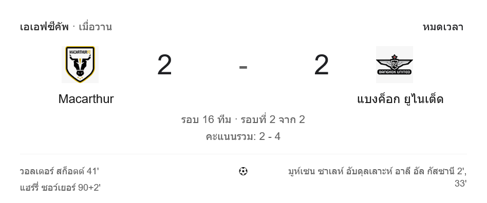 - ⚽ นาที 90+2 แฮร์รี ซอวเยอร์ ทำประตูให้ แม็คอาร์เธอร์ เอฟซี ตีเสมอ 2-2