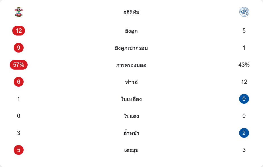 รูปเกมสะท้อนผ่านตัวเลขแบบไม่ต้องตีความเยอะ เซาธ์แฮมป์ตันยิงทั้งหมด 12 ครั้ง และเข้ากรอบถึง 9 ครั้ง ขณะที่ QPR ยิง 5 ครั้ง เข้ากรอบแค่ 1 ครั้งเท่านั้น การครองบอลเจ้าถิ่นเหนือกว่าที่ 57 เปอร์เซ็นต์ และยังบังคับให้ทีมเยือนทำฟาวล์สูงถึง 12 ครั้ง เทียบกับเจ้าถิ่น 6 ครั้ง เรื่องวินัยเกม เซาธ์แฮมป์ตันมีใบเหลือง 1 ใบ ส่วน QPR ไม่มีใบเหลืองและไม่มีใบแดงทั้งคู่ ด้านการเล่นริมเส้นและลูกตั้งเตะ เจ้าถิ่นได้เตะมุม 5 ครั้งต่อ 3 ครั้ง และยังมีล้ำหน้า 3 ครั้งต่อ 2 ครั้ง ภาพรวมคือเจ้าถิ่นสร้างโอกาสจริงจังทุกระยะ ส่วนทีมเยือนแทบไม่มีช่วงที่ตั้งเกมบุกยาว ๆ ได้เลย