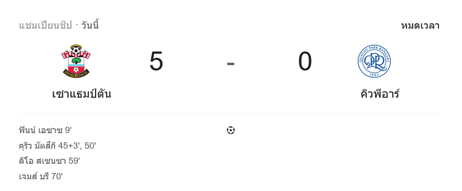• ⏱️ จบเกม เซาธ์แฮมป์ตัน 5-0 QPR