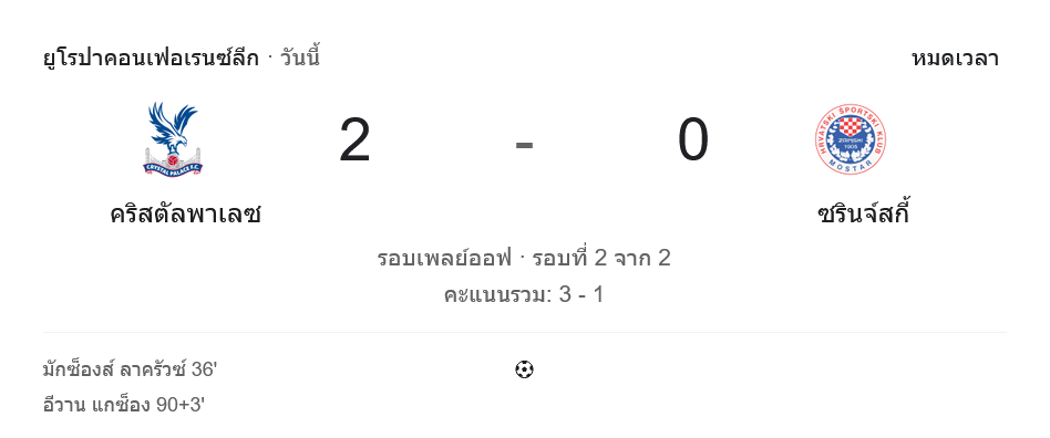 ค่ำคืนบอล ยูโรปา คอนเฟอเรนซ์ ลีก ที่ลอนดอน แฟนบอลที่นั่งเกาะจอดู ผลบอลสด พร้อมกันคงรู้สึกเหมือนกันว่า คริสตัล พาเลซ ของโอลิเวอร์ กลาสเนอร์ ไม่ได้ลงมาแค่เล่นให้ครบสองนัด แต่ลงมาไล่บดให้รู้ไปเลยว่าใครใหญ่ในบ้านตัวเอง เกมนี้เป็นเพลย์ออฟ นัดสอง สกอร์รวมสุดท้ายจบที่ 3-1 ส่งอินทรีผงาดฟ้าทะยานเข้าสู่รอบถัดไป ขณะที่ ซรินสกี้ จากบอสเนียฯ ต้องเก็บกระเป๋ากลับบ้านอย่างเจ็บแสบ
