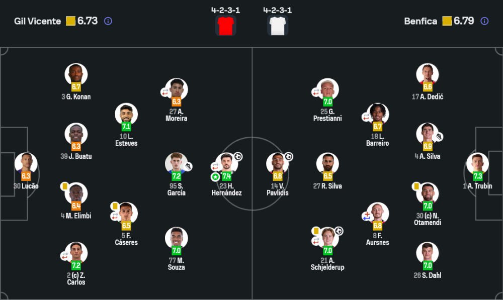 ฝั่งกิล วิเซนเต้เริ่มเกมด้วยความระมัดระวัง แต่พอครึ่งหลังขยับไลน์สูงขึ้น การขึ้นเกมรุกชัดเจนกว่าเดิม โดยใช้การเปลี่ยนจังหวะจากกลางไปช่องข้าง แล้วหาจังหวะตัดเข้ากรอบ ซึ่งประตูตีเสมอเกิดจากการประสานงานที่เรียบง่ายแต่เฉียบ ซานติ การ์เซียจ่ายให้เอร์นานเดซเข้ายิงในพื้นที่ที่แนวรับเบนฟิก้าหลุดโซน