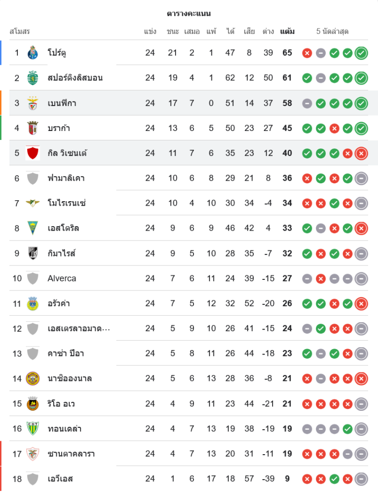 สถานการณ์ตารางคะแนน ซูเปอร์ลีกา โปรตุเกส