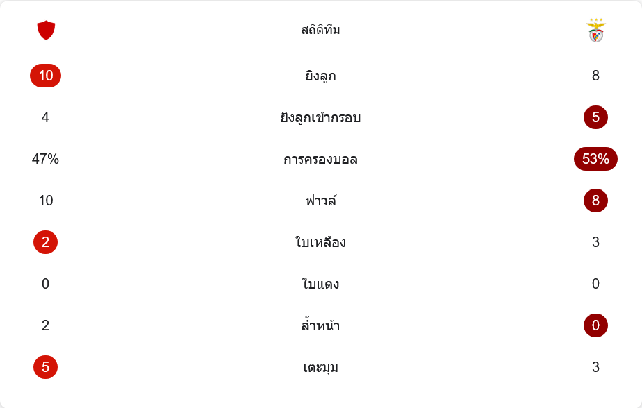 รูปเกมออกมาเบียดสุดๆ กิล วิเซนเต้มีโอกาสยิงรวม 10 ครั้ง เข้ากรอบ 4 ครั้ง ส่วนเบนฟิก้ายิง 8 ครั้งแต่เข้ากรอบมากถึง 5 ครั้ง ความต่างคือคุณภาพของจังหวะจบสกอร์ การครองบอลเบนฟิก้าทำได้มากกว่าเล็กน้อยที่ 53 เปอร์เซ็นต์ ขณะที่เจ้าถิ่น 47 เปอร์เซ็นต์ เกมนี้ยังดุเรื่องวินัย ใบเหลืองกิล วิเซนเต้ 2 ใบ เบนฟิก้า 3 ใบ ไม่มีใบแดง ทั้งสองทีมเล่นลูกตั้งเตะเยอะ กิล วิเซนเต้ได้เตะมุม 5 ครั้ง เบนฟิก้า 3 ครั้ง และมีจังหวะล้ำหน้าของเจ้าถิ่น 2 ครั้ง ขณะที่ทีมเยือนไม่ล้ำหน้าเลย