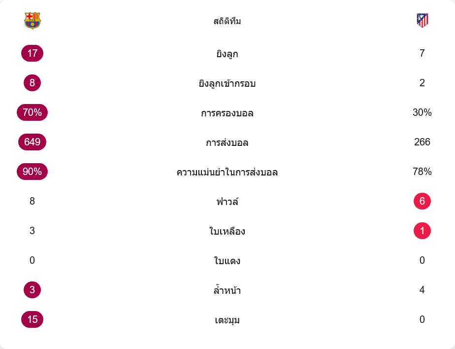 เกมนี้ตัวเลขมันฟ้องตรง ๆ ว่าบาร์ซ่าคุมทุกอย่างอยู่มือ เจ้าบ้านยิงรวม 17 ครั้ง เข้ากรอบ 8 หน ขณะที่แอตฯ ได้ยิงแค่ 7 และตรงกรอบเพียง 2 การครองบอลเป็นของบาร์เซโลน่าถึง 70% ต่อ 30% พร้อมจำนวนการจ่ายบอล 649 ต่อ 266 และความแม่นยำในการส่งบอล 90% เหนือกว่า 78% ชัดเจน เกมฟาวล์ใกล้เคียงกัน 8 ต่อ 6 ใบเหลืองบาร์ซ่า 3 ใบ แอตฯ 1 ใบ ไม่มีใบแดง ทั้งยังเห็นภาพเกมรุกชัดจากจำนวนเตะมุมที่บาร์ซ่ากดไปถึง 15 ครั้ง ขณะที่แอตฯ ได้ 0 ครั้ง ซึ่งเป็นต้นตอสำคัญของสกอร์ที่ขาดลอย