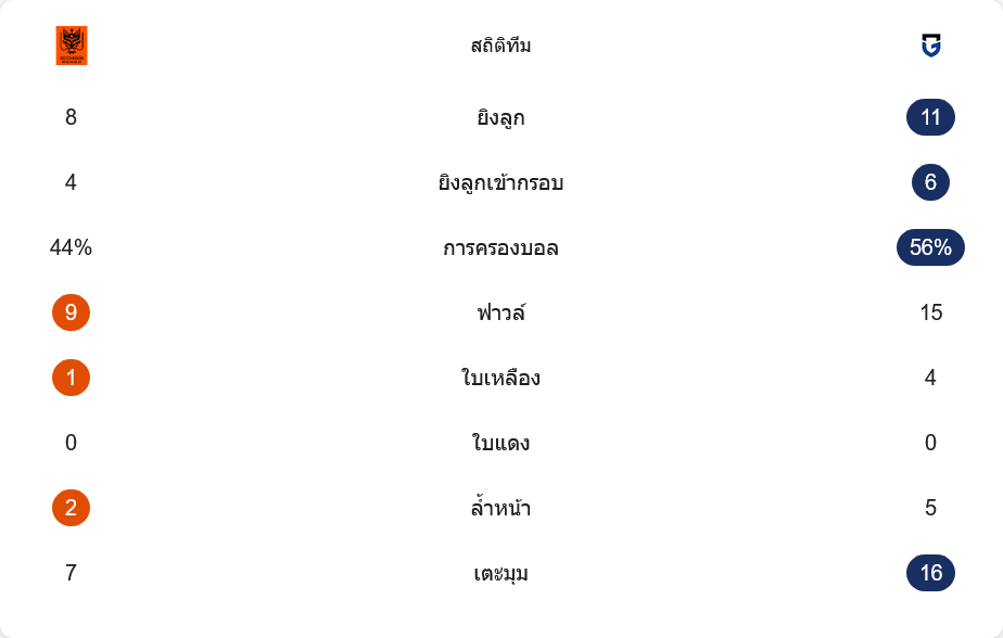 เกมนี้กัมบะ โอซาก้า ยิงมากกว่า 11 ครั้ง เข้ากรอบ 6 ครั้ง ส่วนราชบุรียิง 8 ครั้ง เข้ากรอบ 4 ครั้ง ทีมเยือนครองบอล 56 เปอร์เซ็นต์ ขณะที่ราชบุรีมี 44 เปอร์เซ็นต์ นอกจากนี้กัมบะยังได้เตะมุมมากถึง 16 ครั้ง เทียบกับราชบุรี 7 ครั้ง สะท้อนชัดว่าพวกเขาเป็นฝ่ายกดดันได้มากกว่าในภาพรวม แม้เจ้าถิ่นจะสู้ได้ดีและมีโอกาสสำคัญหลายช่วงของเกม