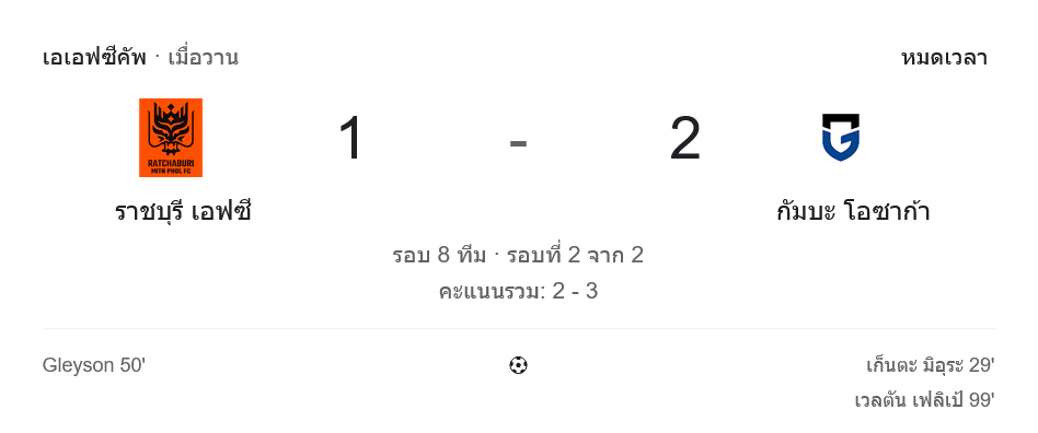 ผลบอลสด ศึก เอเอฟซี แชมเปี้ยนส์ ลีก ทู 2025/26 ราชบุรี เอฟซี สู้เต็มที่ก่อนพ่าย กัมบะ โอซาก้า 1-2 ในช่วงต่อเวลาพิเศษ รวมผลสองนัดแพ้ 2-3 ชวดเข้ารอบอย่างน่าเสียดาย เกมนี้เจ้าถิ่นมีทั้งจังหวะฮึดตีเสมอ มีโอกาสแซงจากจุดโทษ แต่สุดท้ายความคมของทีมเยือนเป็นตัวตัดสิน