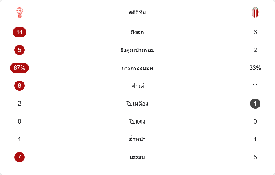 เกมนี้อูรากันเหนือกว่าชัดในเชิงตัวเลข พวกเขายิง 14 ครั้ง เข้ากรอบ 5 ครั้ง ครองบอล 67 เปอร์เซ็นต์ และได้เตะมุม 7 ครั้ง ขณะที่บาร์รากัส เซ็นทรัลยิง 6 ครั้ง เข้ากรอบ 2 ครั้ง ครองบอล 33 เปอร์เซ็นต์ และได้เตะมุม 5 ครั้ง เรื่องฟาวล์ทีมเยือนทำมากกว่าที่ 11 ครั้ง ส่วนอูรากันทำ 8 ครั้ง ทั้งสองทีมไม่มีใบแดง และล้ำหน้าฝั่งละ 1 ครั้ง ภาพรวมสะท้อนชัดว่าเจ้าบ้านบุกมากกว่า แต่ทีมเยือนรับแน่นและมีประตูที่เหนียวจริง