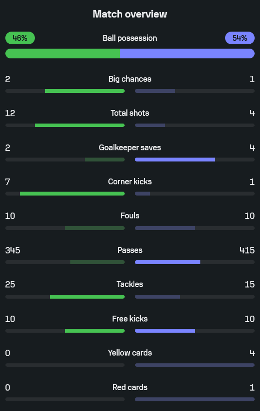 - เปลี่ยนตัว : ลี เอ็นดลอฟู 6.3, คีแนน เบนเน็ตต์ส 6.1, ลุค บราวน์ 6.4, ฮารัลด์ ทังเก้น 6.6, แมทธิว เดนนิส 6.8, แฮร์รี กริฟฟิธส์ ไม่ได้ลงสนาม, เจย์เดน ลูเกอร์ ไม่ได้ลงสนาม