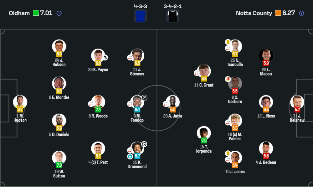 Kane Drummond คือผู้เล่นยอดเยี่ยมของเกมนี้ด้วยคะแนน 8.7 หลังยิงประตูเบิกร่องตั้งแต่นาที 5 และเป็นตัวเร่งเกมรุกของโอลด์แฮมได้อันตรายตลอดทั้งเกม เขาทั้งพาบอลขึ้นหน้า เร่งจังหวะ และสร้างแรงกดดันให้แนวรับทีมเยือนอย่างต่อเนื่อง เป็นหัวใจสำคัญที่ทำให้เจ้าถิ่นเปิดเกมได้ง่ายขึ้นก่อนจะไหลไปสู่ชัยชนะขาดลอย