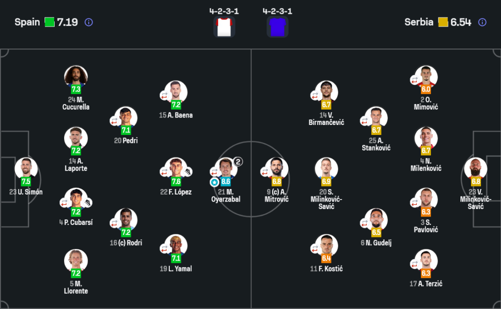 - กองหน้า : อเล็กซ์ บาเอน่า 7.2 , มิเกล โอยาร์ซาบัล 8.6 , ลามีน ยามาล 7.1