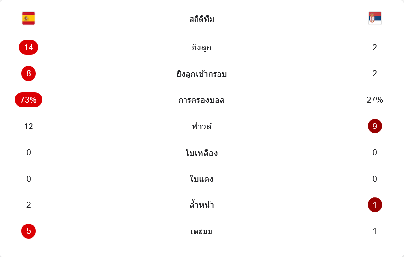 เกมนี้สเปนเหนือกว่าชัดเจน ยิง 14 ครั้ง เข้ากรอบ 8 ครั้ง ขณะที่เซอร์เบียยิงแค่ 2 ครั้งและตรงกรอบ 2 หน สเปนครองบอล 73 เปอร์เซ็นต์ ได้เตะมุม 5 ครั้ง ส่วนเซอร์เบียได้เพียง 1 ครั้ง แม้ทั้งสองทีมจะมีจังหวะฟาวล์พอสมควร แต่ไม่มีใบเหลืองและใบแดงเกิดขึ้น สถิติทั้งหมดสะท้อนชัดว่าสเปนเป็นฝ่ายคุมเกมแทบทั้งหมดตั้งแต่ต้นจนจบ
