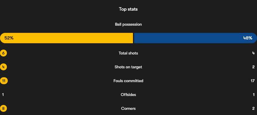 แม้สัดส่วนการครองบอลจะใกล้เคียงกัน โดยแพทริค ธิสเทิ่ลมี 52 เปอร์เซ็นต์ ส่วนรอสส์ เคาน์ตี้มี 48 เปอร์เซ็นต์ แต่คุณภาพเกมรุกต่างกันชัด เจ้าถิ่นยิง 6 ครั้ง เข้ากรอบ 4 ครั้ง และเปลี่ยนเป็น 3 ประตู ขณะที่ทีมเยือนยิง 4 ครั้ง เข้ากรอบ 2 ครั้ง ได้เพียงลูกเดียว นอกจากนี้แพทริคยังได้เตะมุมมากถึง 8 ครั้ง เทียบกับรอสส์ เคาน์ตี้ที่ได้ 2 ครั้ง ส่วนการฟาวล์ ทีมเยือนทำถึง 17 ครั้ง มากกว่าเจ้าบ้านที่ทำ 11 ครั้ง สะท้อนว่าพวกเขาต้องตัดเกมหนักพอสมควร