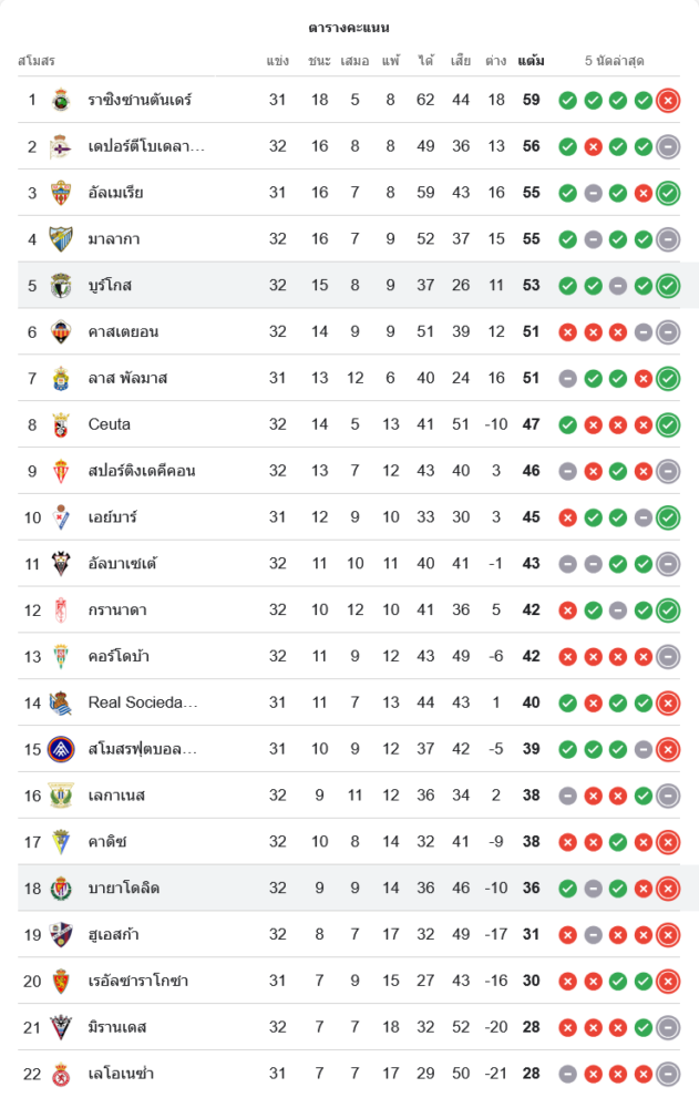สถานการณ์ในตารางคะแนนเซกุนด้า ดิบิซิออน สเปน