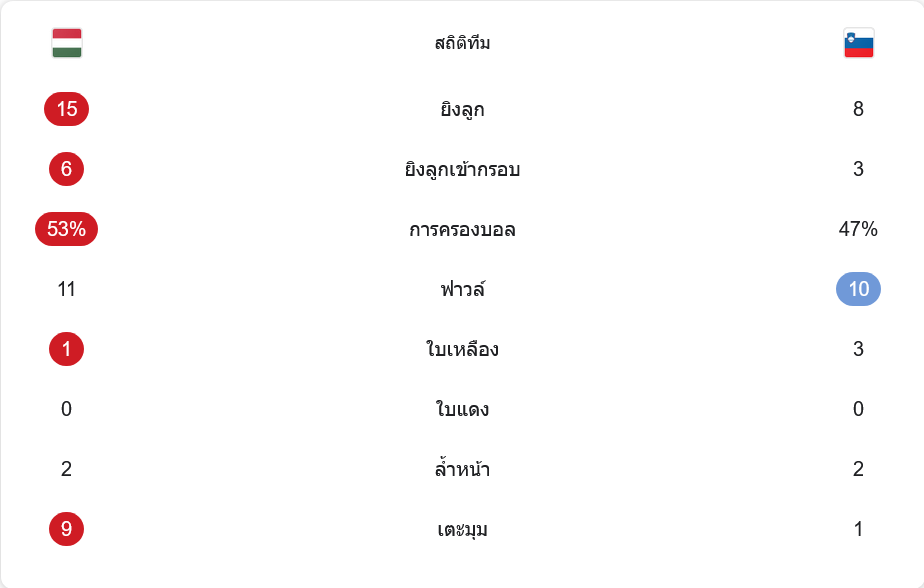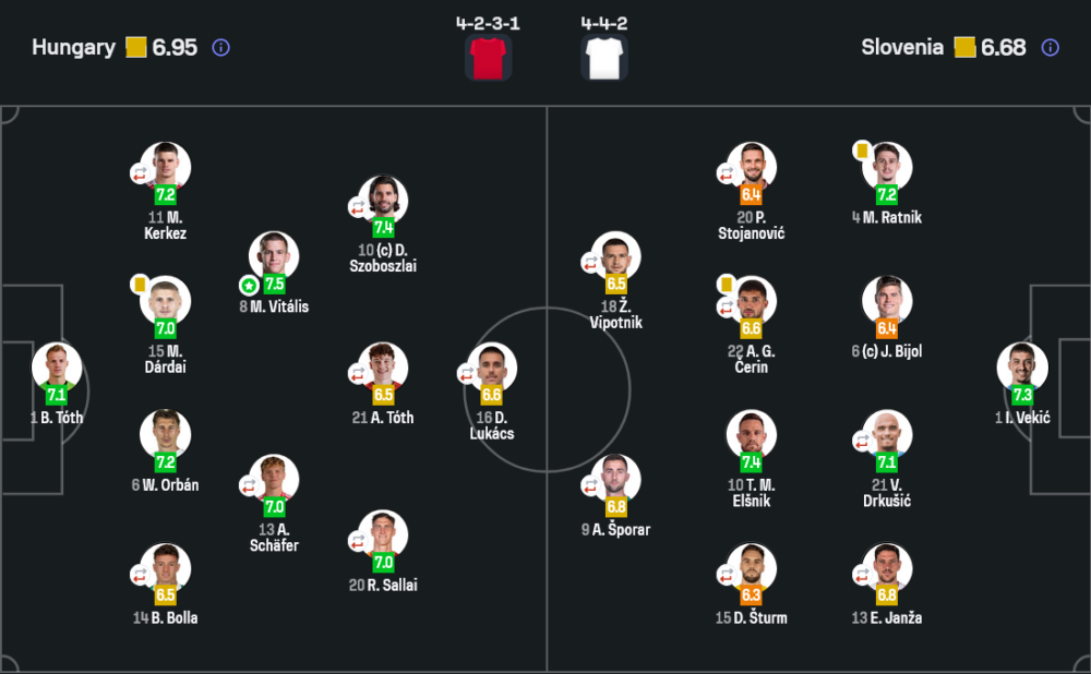 สโลวีเนียเล่นระบบ 4-4-2 แบบเน้นวินัยและบล็อกเกมตรงกลาง พวกเขายืนรับได้ดีในครึ่งแรก และอาศัยจังหวะสวนจาก ชโปราร์ กับ ชตูร์ม เป็นหลัก แต่เมื่อเกมยืดไปครึ่งหลัง ความแน่นเริ่มลดลง โดยเฉพาะด้านข้างและจังหวะตามประกบ ทำให้โดนฮังการีกดดันหนักขึ้นเรื่อยๆ สุดท้ายความแตกต่างอยู่ที่การแก้เกมและความเฉียบคมในพื้นที่สุดท้าย ซึ่งฮังการีทำได้ดีกว่า