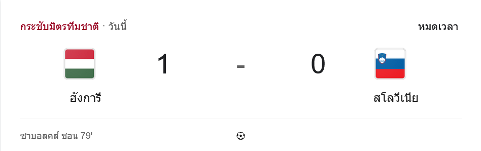 ศึก ผลบอลสด รายการ กระชับมิตรทีมชาติ คู่นี้จบลงด้วยชัยชนะของฮังการีที่เฉือนสโลวีเนีย 1-0 จากประตูโทนของ ซาบอลช์ เชิน ในนาทีที่ 79 หลังเกมอึดอัดกันอยู่นานตลอดสองครึ่งเวลา บ้านกีฬา มองว่านี่คือแมตช์ที่เจ้าถิ่นคุมจังหวะได้เหนือกว่าเล็กน้อย และอาศัยความเฉียบคมของตัวสำรองปิดบัญชีได้สำเร็จ