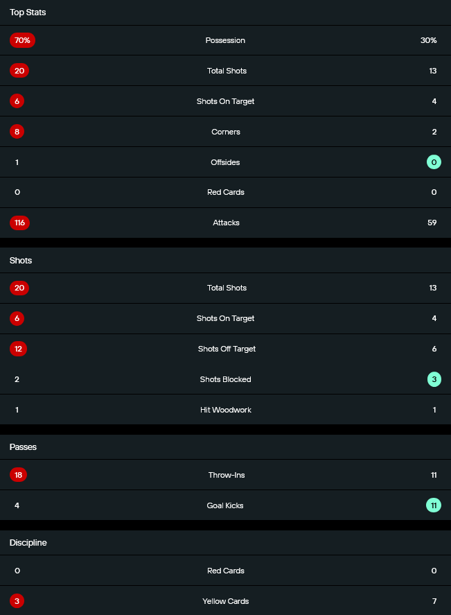 อาร์เมเนียครองบอล 70 เปอร์เซ็นต์ ยิง 20 ครั้ง เข้ากรอบ 6 ครั้ง และได้เตะมุม 8 ครั้ง ขณะที่เบลารุสครองบอล 30 เปอร์เซ็นต์ ยิง 13 ครั้ง เข้ากรอบ 4 ครั้ง และได้เตะมุม 2 ครั้ง เจ้าถิ่นมีเกมรุกมากถึง 116 ครั้ง เทียบกับ 59 ครั้งของทีมเยือน แต่เบลารุสใช้โอกาสได้คุ้มกว่า และนั่นคือเหตุผลสำคัญที่ทำให้แฟน บ้านผลบอล เห็นผลการแข่งขันสวนกับรูปเกมอย่างชัดเจน