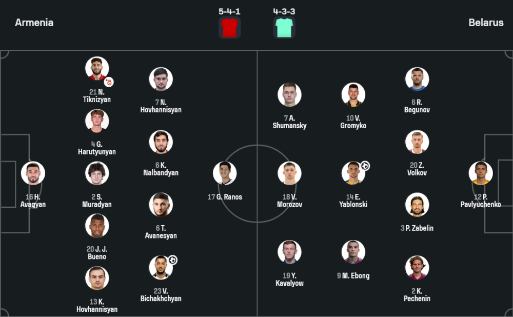 - เปลี่ยนตัว : Arsen Beglaryan , Arman Nersesyan , Erik Piloyan , Edgar Grigoryan , Arsen Sadoyan , Artur Serobyan , Gor Manvelyan , Karlen Hovhannisyan , Artem Bandikyan , Artur Askaryan , Finn Geragusyan