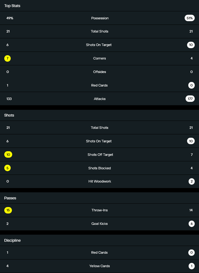 เกมนี้ตัวเลขหลายอย่างใกล้เคียงกันมาก ลิทัวเนียครองบอล 49 เปอร์เซ็นต์ ส่วนจอร์เจีย 51 เปอร์เซ็นต์ และทั้งสองทีมยิงเท่ากันที่ 21 ครั้ง แต่ความต่างอยู่ที่คุณภาพการจบสกอร์ เพราะจอร์เจียยิงเข้ากรอบ 10 ครั้ง ขณะที่ลิทัวเนียเข้ากรอบเพียง 6 ครั้ง เจ้าถิ่นได้เตะมุมมากกว่าที่ 7 ต่อ 4 แต่เปลี่ยนเป็นประตูไม่ได้ ส่วนจอร์เจียบุกได้ต่อเนื่องกว่า จากจำนวนการบุก 177 ครั้ง เทียบกับ 133 ครั้งของลิทัวเนีย อีกจุดที่เห็นชัดคือวินัยในเกม เพราะลิทัวเนียโดน 4 ใบเหลืองและ 1 ใบแดง ต่างจากจอร์เจียที่เสียแค่ 1 ใบเหลือง จึงไม่แปลกที่ทีมเยือนจะปิดเกมได้แบบมั่นคงกว่า