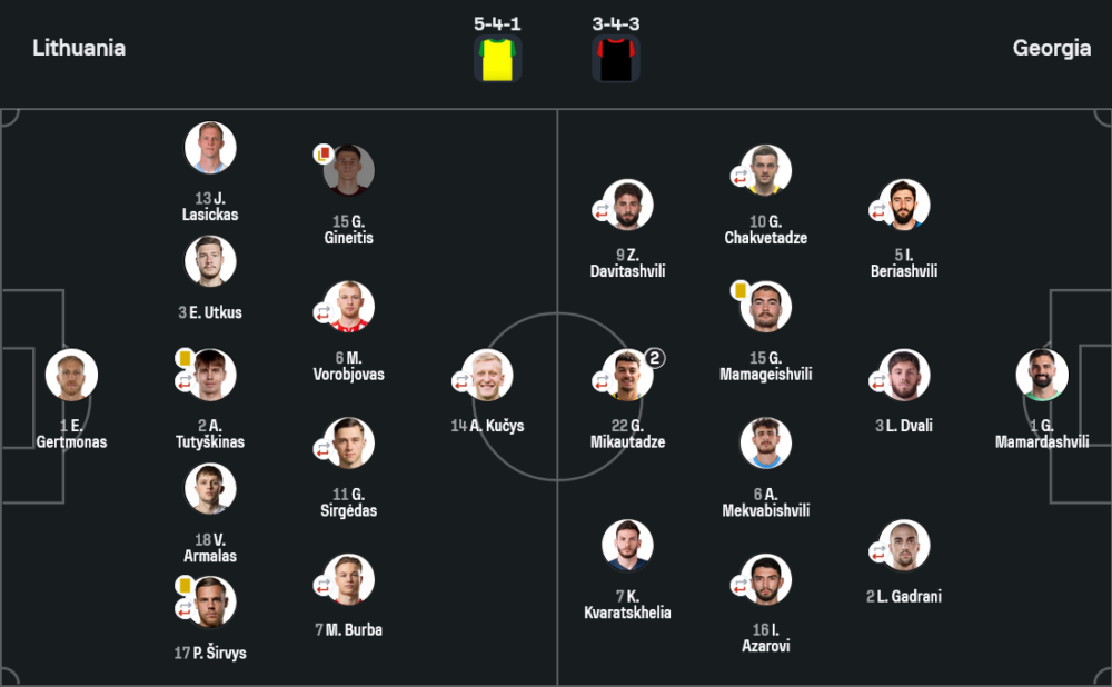 ลิทัวเนียมาในระบบ 5-4-1 เน้นรับแน่นและรอโต้กลับ ใช้แผงหลังหลายคนช่วยปิดพื้นที่หน้ากรอบเขตโทษ แต่ปัญหาคือเมื่อโดนจอร์เจียเร่งจังหวะในครึ่งหลัง แนวรับเริ่มเสียตำแหน่งง่ายขึ้น เกมรุกของเจ้าบ้านพยายามฝากบอลไปที่ คูชีส และให้ กิเนติส ช่วยเชื่อมจากแถวสอง ทว่าความต่อเนื่องยังไม่มากพอ ทำให้โอกาสที่มีกลายเป็นเพียงจังหวะหวาดเสียว