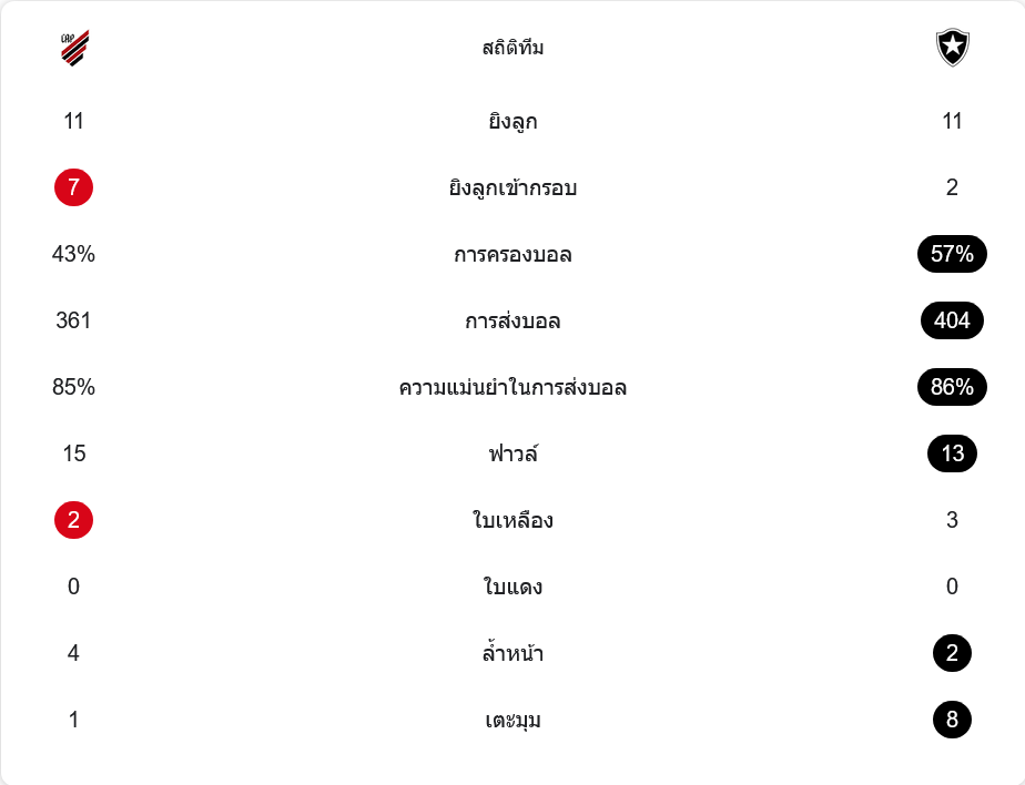 แม้โบตาโฟโก้จะครองบอลมากกว่าที่ 57 เปอร์เซ็นต์ และจ่ายบอล 404 ครั้ง มากกว่าแอตเลติโก พาราเนนเซ่ที่จ่าย 361 ครั้ง แต่เจ้าบ้านมีคุณภาพเกมรุกดีกว่ามาก ค่า xG อยู่ที่ 1.42 ต่อ 0.81 และสร้างโอกาสสำคัญได้ 4 ครั้ง ขณะที่ทีมเยือนมีเพียง 1 ครั้ง ทั้งสองฝั่งยิง 11 ครั้งเท่ากัน แต่แอตเลติโก พาราเนนเซ่ยิงเข้ากรอบ 7 ครั้ง ส่วนโบตาโฟโก้เข้ากรอบแค่ 2 ครั้ง แม้ทีมเยือนจะได้เตะมุมมากถึง 8 ครั้ง แต่เปลี่ยนเป็นประตูได้แค่ลูกเดียว สุดท้ายความคมจึงเป็นตัวตัดสินเกมนี้อย่างแท้จริง
