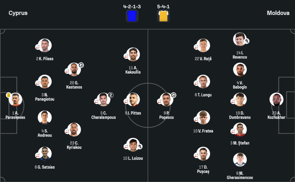 มอลโดวาวางระบบ 5-4-1 เน้นรับลึกและรอสวนกลับ แต่ช่วงครึ่งแรกถอยต่ำเกินไป ทำให้โดนไซปรัสกดใส่ต่อเนื่อง อย่างไรก็ตามครึ่งหลังพวกเขาแก้เกมได้ดีขึ้นมาก เปลี่ยนตัวเร็ว เพิ่มพลังในแดนกลาง และกล้าเติมเกมรุกมากกว่าเดิม