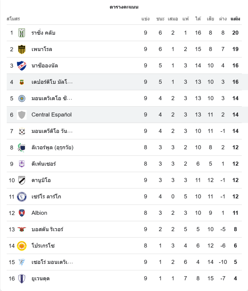 สถานการณ์ในตารางคะแนนอุรุกวัย พรีเมียร์ดิวิชั่น