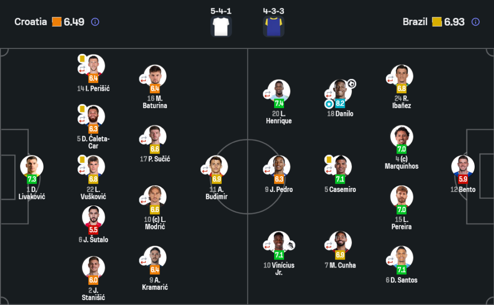 บราซิลมาในระบบ 4-3-3 ที่เน้นความเร็ว เกมสวนกลับ และการเล่นงานพื้นที่ด้านข้าง ส่วนโครเอเชียยืน 5-4-1 เพื่ออัดแน่นเกมรับแล้วรอจังหวะสวนกลับเช่นกัน ความต่างของเกมนี้อยู่ที่การเปลี่ยนจากรับเป็นรุกของบราซิลที่เฉียบกว่า ทุกครั้งที่มีพื้นที่ วินิซิอุส และตัวรุกฝั่งแซมบ้าสามารถพาบอลไปเล่นงานแนวรับโครเอเชียได้ทันที