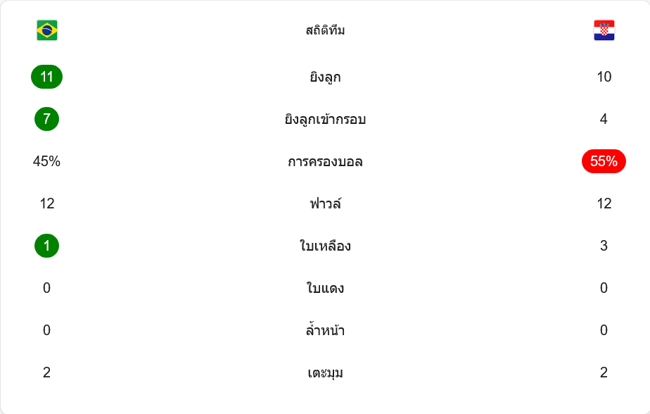 ในมุม วิเคราะห์บอล เกมรุก บราซิลไม่ได้เหนือกว่าแบบครองเกมเบ็ดเสร็จ แต่พวกเขาคมกว่าอย่างชัดเจน ประตูแรกและประตูสามมาจากจังหวะสวนกลับเร็วที่ใช้พื้นที่ได้คุ้ม ส่วนประตูที่สองก็มาจากความนิ่งในจังหวะกดดัน ขณะที่โครเอเชียต่อบอลได้ดี ครองบอลมากกว่า แต่เมื่อถึงพื้นที่สุดท้ายยังขาดความเด็ดขาด ต้องอาศัยลูกยิงไกลของมาเยอร์เป็นตัวปลุกเกม