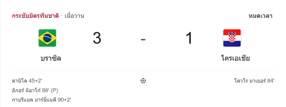 - ⚽ นาที 90+2 บราซิลปิดเกม 3-1 กาเบรียล มาร์ติเนลลี ยิงสวนกลับคมกริบ