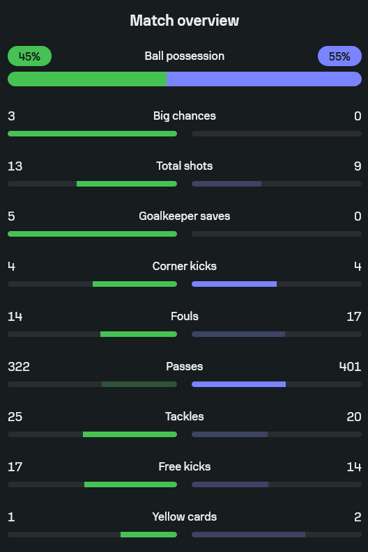 วีแกนมาในระบบ 3-4-1-2 เน้นเกมตรงและจังหวะเข้าทำเร็ว จุดเด่นคือการเก็บจังหวะสองและการบุกกดดันตั้งแต่ครึ่งแรก ทำให้มีโอกาสยิงมากกว่าและสร้างบิ๊กชานซ์ได้ถึง 3 ครั้ง เกมรับของเจ้าถิ่นก็ยืนระยะได้ดี โดยมี แซม ทิคเคิล เป็นตัวชูโรงที่ช่วยเซฟจังหวะสำคัญหลายครั้ง