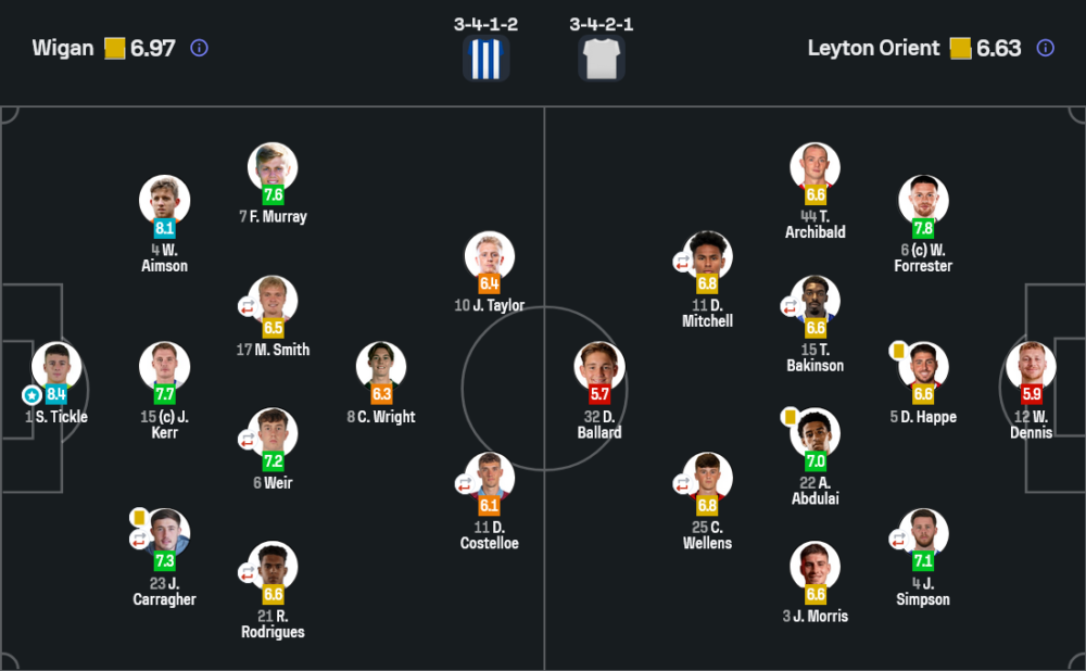 ผู้เล่นยอดเยี่ยมของเกมนี้คือ แซม ทิคเคิล นายทวารวีแกน ที่คว้าคะแนน 8.4 จากการเซฟหลายจังหวะสำคัญ โดยเฉพาะในครึ่งหลังที่เลย์ตัน โอเรียนท์ บุกหนักขึ้นอย่างชัดเจน เขาคือเหตุผลหลักที่ทำให้เจ้าถิ่นไม่เสียประตูและยังเก็บแต้มได้สำเร็จ