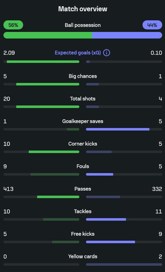 เกมนี้เคมบริดจ์ครองบอล 56 เปอร์เซ็นต์ มากกว่าสวินดอนที่มี 44 เปอร์เซ็นต์ และมีค่า xG สูงถึง 2.09 เทียบกับ 0.10 เจ้าถิ่นยิงรวม 20 ครั้ง ส่วนทีมเยือนยิงเพียง 4 ครั้ง โอกาสทองก็เป็นเคมบริดจ์ที่ทำได้ 5 ครั้ง ขณะที่สวินดอนมีแค่ 1 ครั้งเท่านั้น นอกจากนี้เคมบริดจ์ยังได้เตะมุม 10 ครั้ง ต่อ 5 ครั้ง และผ่านบอลมากกว่า 413 ต่อ 332 ครั้งอีกด้วย ด้าน บ้านผลบอล คู่นี้ถือเป็นเกมที่ตัวเลขบอกชัดว่าเจ้าถิ่นควรชนะ แต่ฟุตบอลลงโทษทีมที่ปิดเกมไม่ได้เสมอ