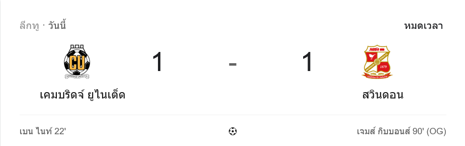 เมื่อปิดบัญชีไม่ลง บทลงโทษก็ตามมา นาที 90 สวินดอนตีเสมอ 1-1 จากจังหวะที่ เจมส์ กิบบอนส์ ทำเข้าประตูตัวเอง ช่วงทดเจ็บเคมบริดจ์ยังบุกต่อ แต่เจาะไม่เข้า จบเกมแบ่งกันไปทีมละแต้มแบบที่เจ้าถิ่นต้องเสียดายหนัก