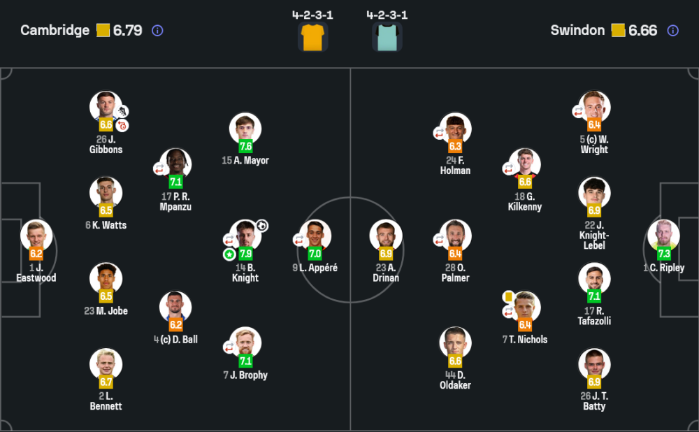 รางวัลผู้เล่นยอดเยี่ยมตกเป็นของ เบน ไนท์ ที่ได้คะแนน 7.9 เขาทั้งยิงประตู, เชื่อมเกม และสร้างปัญหาให้แนวรับสวินดอนตลอดทั้งเกม เป็นตัวอันตรายที่สุดของเคมบริดจ์อย่างแท้จริง